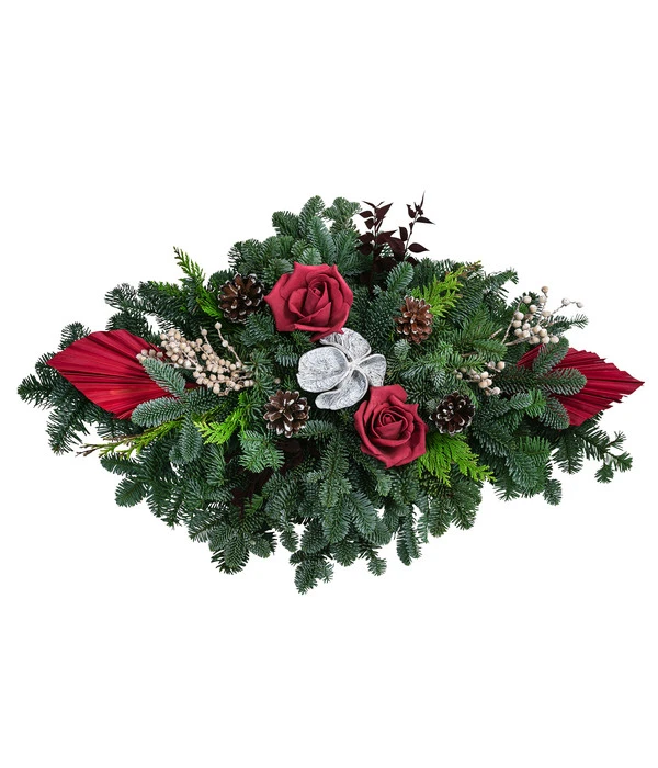 Möchten Sie einen geliebten, verstorbenen Mitmenschen an Allerheiligen oder am Totensonntag ehren und benötigen Sie noch einen pflegeleichten Grabschmuck, der auf einem Doppelgrab stilvoll zur Geltung kommt? Dann ist dieses ovale Grabgesteck mit der Breite von ca. 60 cm die ideale Lösung für Sie. Das Gesteck wurde von erfahrenen Floristen zu einem üppigen, flachen Legestrauß von Hand gebunden und mit hochwertigen Deko-Elementen in klassischem Rot dekoriert. Dank seiner Maße ist es besonders gut für große Gräber mit Abdeckung aus Stein geeignet und lässt die Ruhestätte Ihrer lieben Verstorbenen bei jedem Besuch im Winter wie frisch dekoriert wirken.