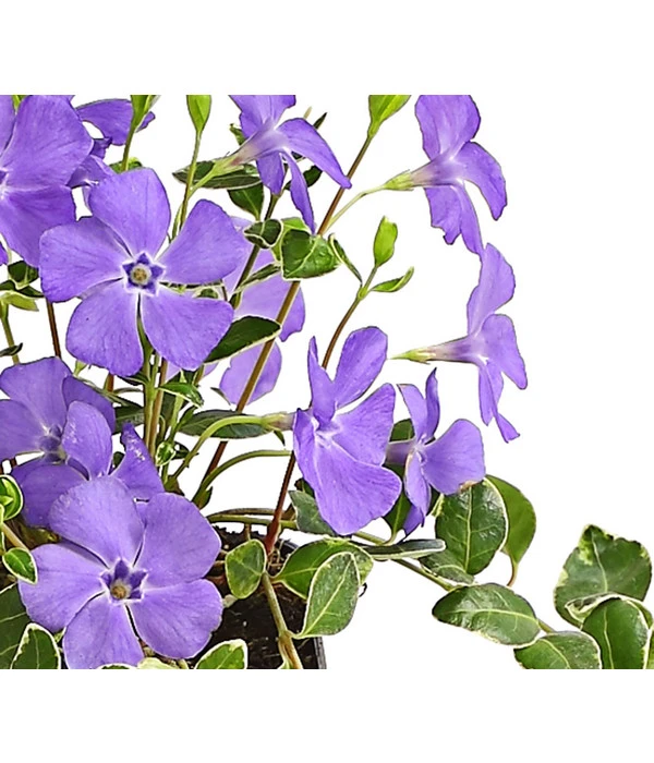 Bei Gartengestaltern ist das Immergrün eine beliebte Pflanze, denn der robuste Bodendecker bildet zuverlässig pflegeleichte immergrüne Flächen und sieht dabei besonders hübsch aus! Die Sorte besonders dekorative Blätter, die mit einem dünnen weißen Rand umrahmt sind, was dem dichten Laubteppich eine lebendig leuchtende Optik verleiht. Zur Hauptblütezeit von März bis Mai strahlen unzählige intensiv blau-violette Blütensterne mit dem weiß-panaschierten Laub um die Wette. Und als könnten sich die Blüten einfach nicht verabschieden, erscheinen bis zum Herbst immer wieder einzelne Blüten und setzen blauviolette Farbtupfer. Neben seinem hübschen Erscheinungsbild punktet das Immergrün ‚Ralph Shugert‘ auch mit seiner Wuchskraft und Robustheit – Krankheiten und Schädlingen gibt das Immergrün kaum eine Chance!
