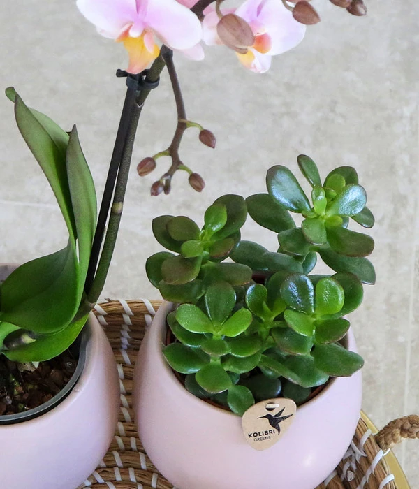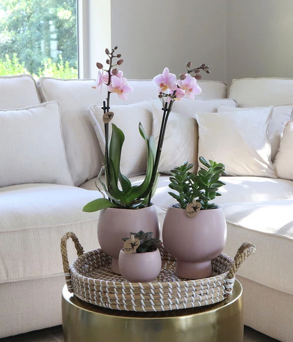 So attraktiv und trotzdem so pflegeleicht? Die Pflanzen im Pflanzen-Arrangement Scandic Nude stehen gerne an einem hellen Ort ohne direkte Sonneneinstrahlung. Da es sich bei Haworthie und Fettkraut um Sukkulenten, also kleine Überlebenskünstler handelt, die auch Wasser speichern können, fällt der Gießaufwand hier kaum ins Gewicht. Die Phalaenopsis wird am liebsten wöchentlich getaucht und regelmäßig mit kalkfreiem Wasser besprüht. Vermeiden Sie auf alle Fälle Staunässe und genießen darüber hinaus einfach die wunderbare Ausstrahlung des Sets.