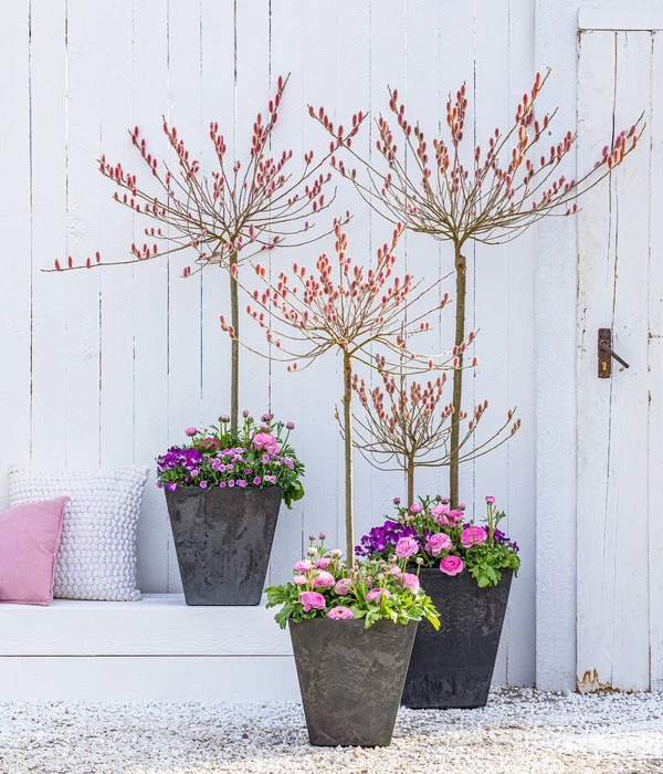 Diese Rotkätzchenweide wurde als Stämmchen gezogen und eignet sich deshalb besonders für die Kübelbepflanzung. Denn so bleibt in einem größeren Kübel noch genügend Raum, um zu Füßen der Rotkätzchenweide weitere Frühlingsblüher wie Hornveilchen, Vergissmeinnicht, niedrige Narzissen und andere zu pflanzen. Ist immer noch Boden unbedeckt, so legen Sie flauschiges Moos darauf und setzen zu Ostern noch einen Deko-Hasen dazu und fertig ist ein reizender Willkommensgruß neben der Haustür.