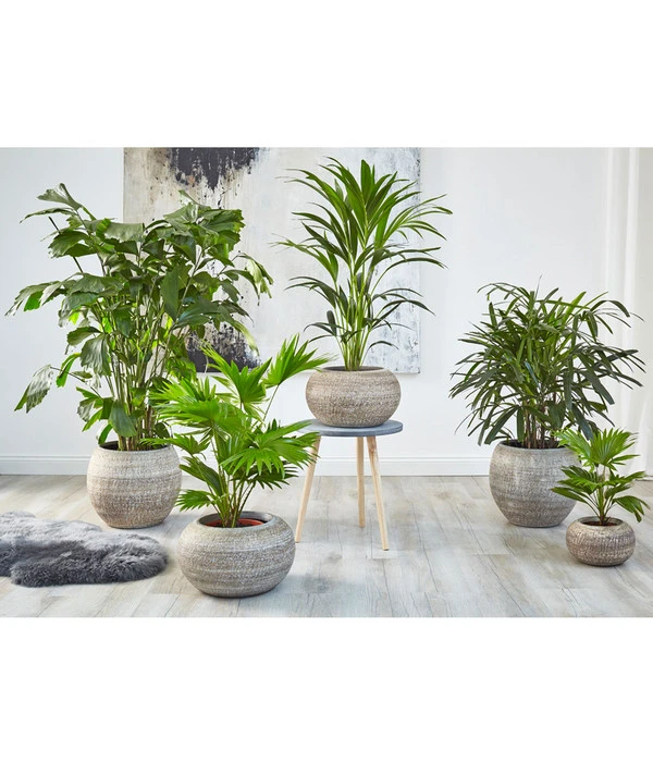 Schlanke, schilfähnliche Stängel recken sich bis in 2 m Höhe, die fächerförmigen Blätter tun ein Übriges, um die Steckenpalme zu einem attraktiven Hingucker im Wohnraum zu machen. Vor ca. 100 Jahren gehörte sie zu den beliebtesten Zimmerpalmen, die in jedem großzügigen Wohnambiente fast ein ‚Muss‘ waren, in den letzten Jahrzehnten aber geriet die dekorative Pflanze ein wenig in Vergessenheit. Wir freuen uns, dass sich heute wieder Liebhaber finden, die ihr Zuhause mit dieser attraktiven Zimmerpalme bereichern möchten. Der dichte, buschförmige Wuchs erinnert an Bambus, weshalb die Pflanze auch unter dem Namen Bambuspalme bekannt ist. Sie stammt ursprünglich aus den feuchten Bergwäldern Chinas, die Rhapis excelsa, die wir Ihnen hier anbieten, ist aber eine Kulturform, die so nicht in der Natur zu finden ist. Fühlt sich die exotische Pflanze bei Ihnen wohl, kann sie sogar weiße bis cremefarbene Blüten bilden. Die Steckenpalme ist ein dekorativer Schmuck für Wintergärten, sie setzt sich aber auch in Treppenhäusern und Eingangshallen dekorativ in Szene.